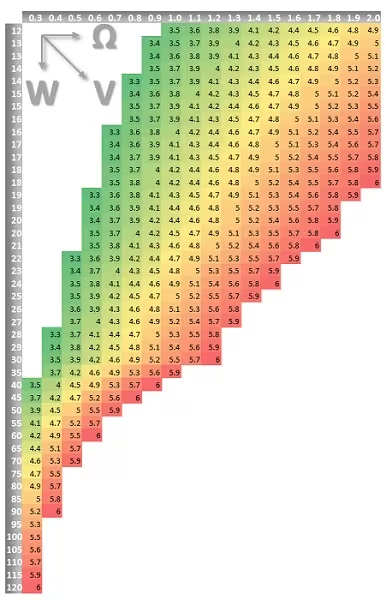Conformément à cette loi, il prend en compte la valeur de la résistance (axe horizontal), le voltage (diagonale) et la puissance (axe vertical). Les couleurs (vert, jaune et rouge) définissent le meilleur choix juste qu’au plus mauvais.