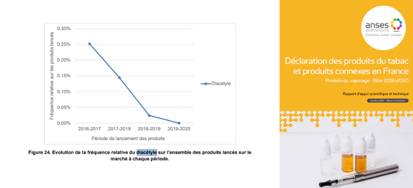 Comme le relève l’ANSES [*], l’utilisation du diacétyle dans les e-liquides français a drastiquement diminué entre 2016 et 2019. Jusqu’à complètement disparaitre en 2020.