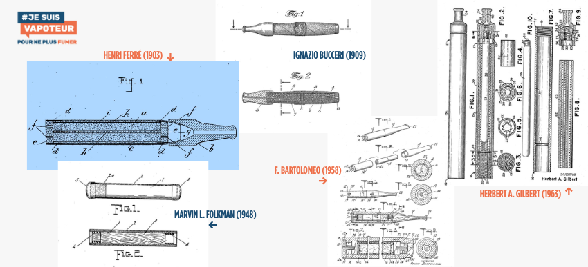 D’abord de l’esprit ingénieux d’Henri Ferré, pharmacien français, qui crée l‘inhalateur tubulaire dès 1903 ! Puis de l’américain Joseph Robinson, qui invente la machine à vapeur électrique médicale à la fin des années 20. Et enfin de celui d’Herbert A. Gilbert, qui dépose un brevet pour une “cigarette sans tabac” en 1963. Sans oublier ces autres créateurs (Ignazio Bucceri en 1909, Marvin L. Folkman en 1948 et F. Bartolomeo en 1958) qui ont tous contribués à la naissance future de la cigarette électronique.