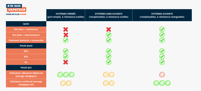 Aussi, pour débuter, les systèmes fermés ont un avantage certain : ils ne requièrent ni réglage ni changement de résistance ni remplissage du réservoir. La personne a seulement à sélectionner le coloris, la saveur et le taux de nicotine adéquat.